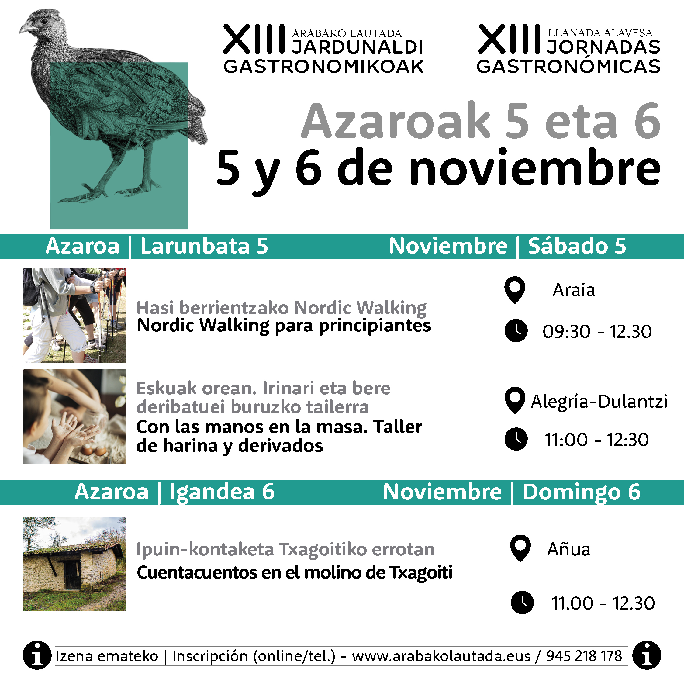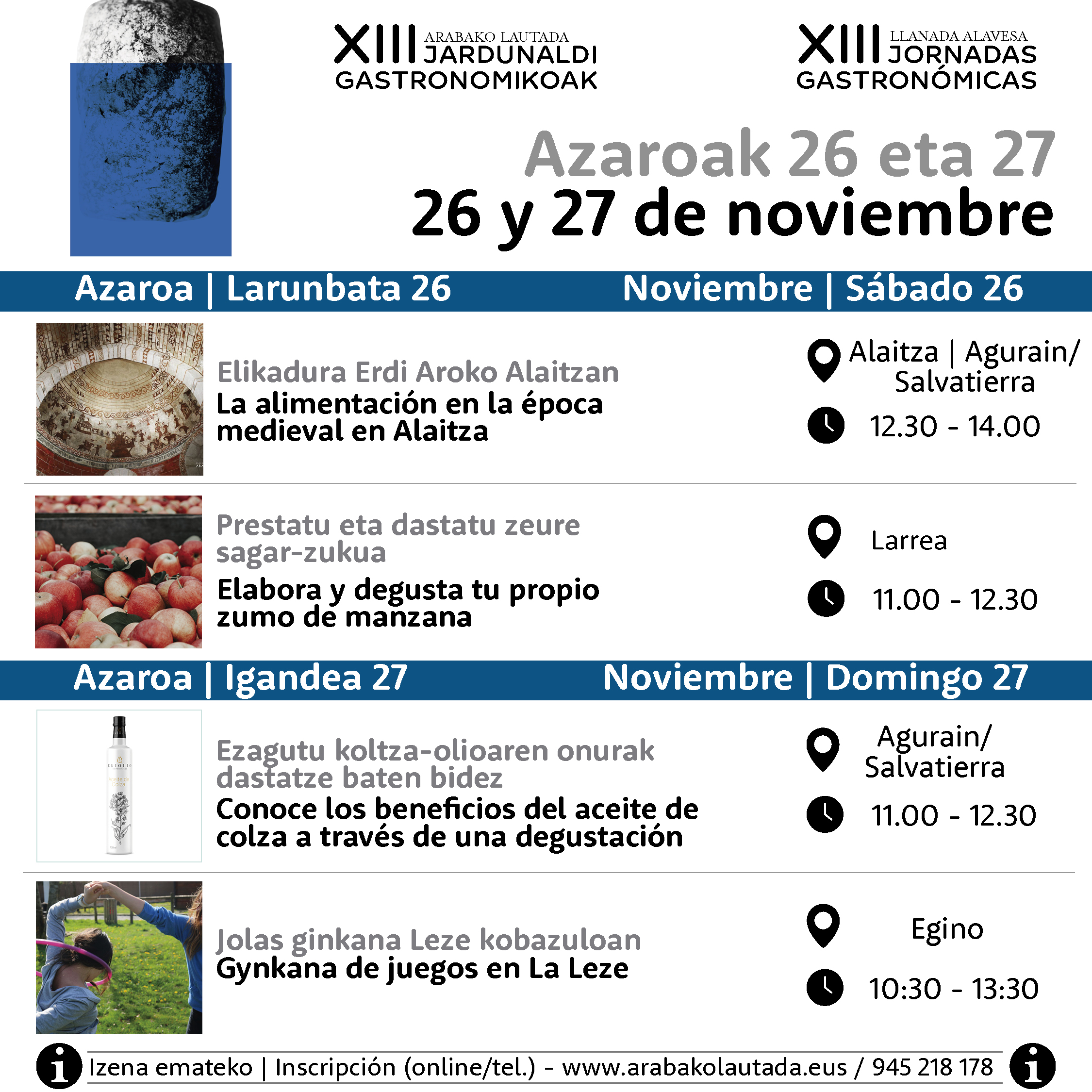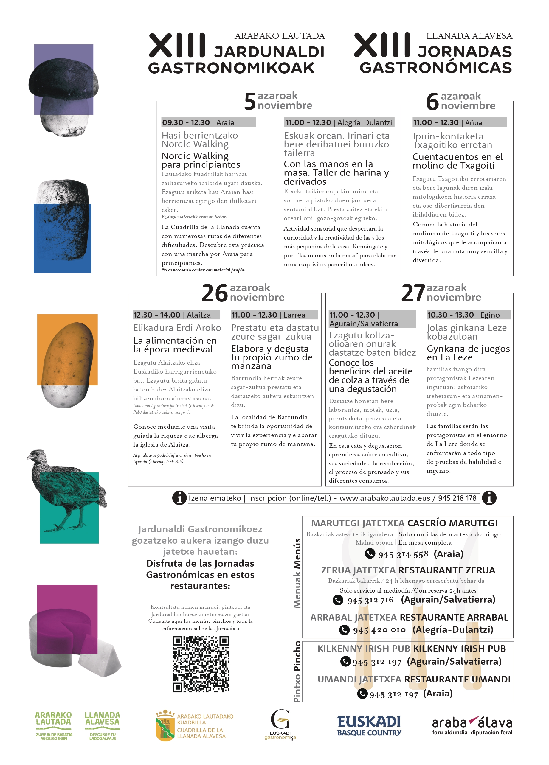 El último fin de semana contará igualmente con un completo programa en el que destaca una visita guiada a una de las Joyas de la Llanada. El sábado, 26 de noviembre, a las 12:30 horas, se explicará cómo era la alimentación en la época medieval a través de las pinturas de la iglesia de Alaitza y se obsequiará con un pintxo inspirado en Llanada al finalizar la visita. Ese mismo sábado pero a las 11:00 horas, conscientes del protagonismo que adquieren las setas y el queso en la Llanada Alavesa, te invitamos a elaborar y degustar tu propio hojaldre. Productos de la tierra con los que cocinar y disfrutar de una agradable mañana en familia.
